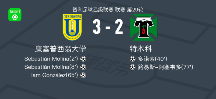 康塞普西翁大学3-2特木科,Sebastián Molina双响,Iam González建功