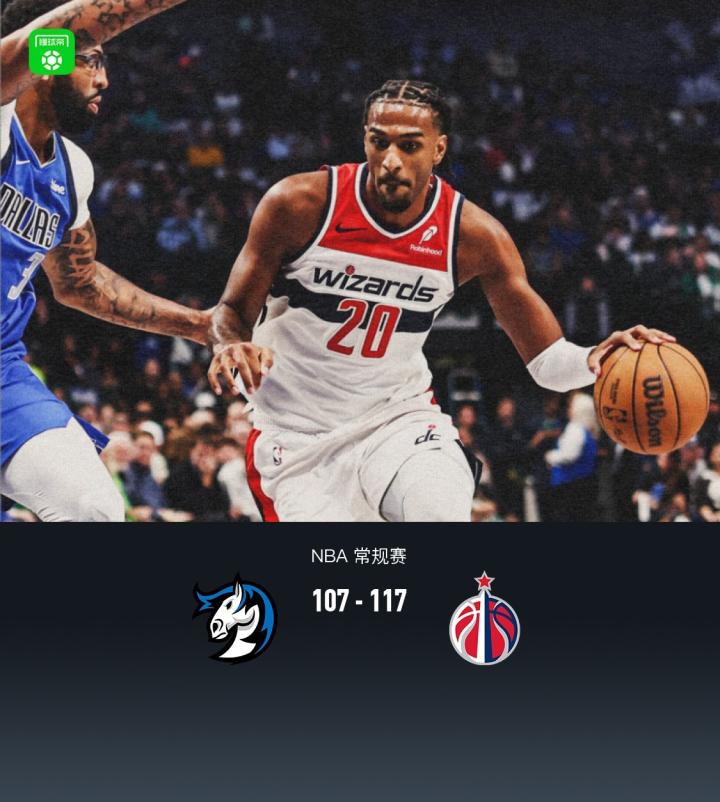 第四节独行侠弗拉格拿下11分,奇才卡林顿拿下6分,最终独行侠107-117不敌奇才