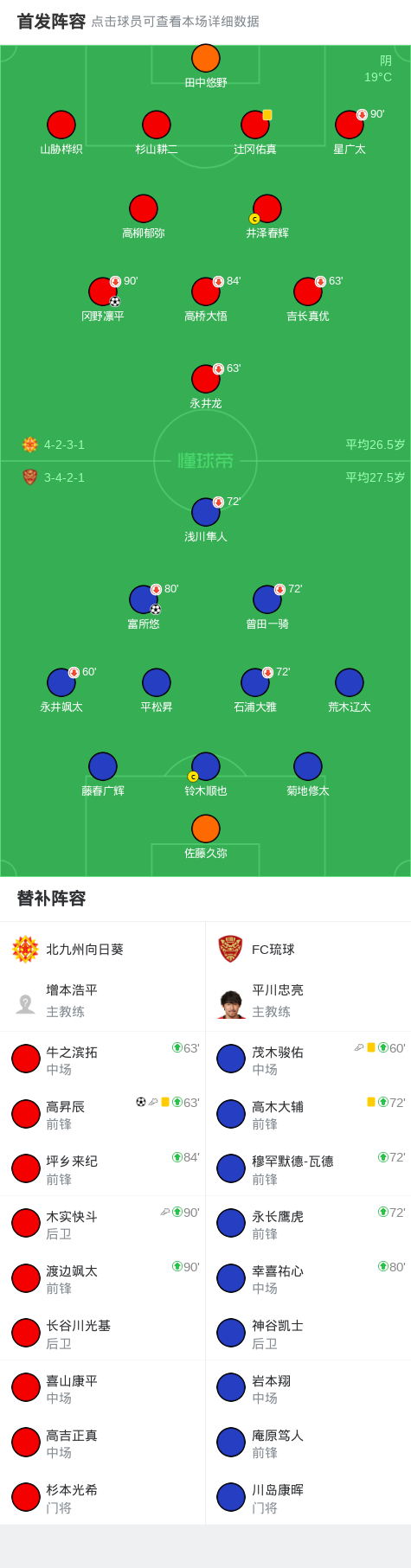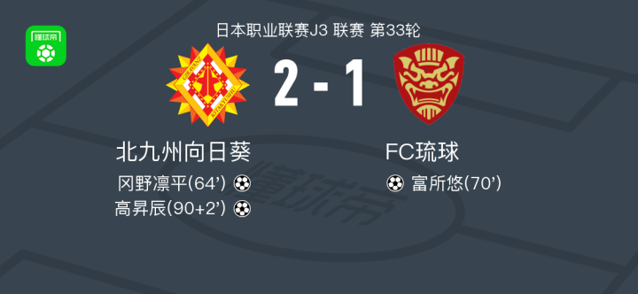 北京时间10月25日日本职业联赛J3 联赛 第33轮,北九州向日葵主场对阵FC琉球。北九州向日葵冈野凛平破门,高昇辰破门。FC琉球富所悠破门。最终比分北九州向日葵 2-1 FC琉球。