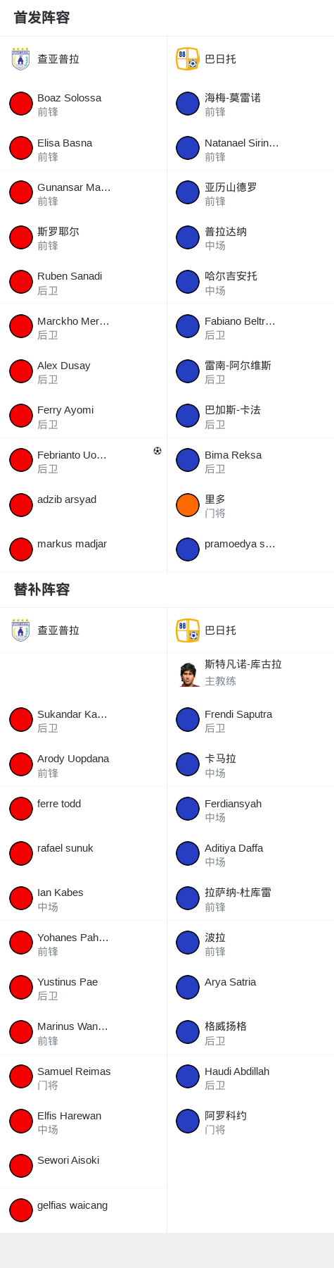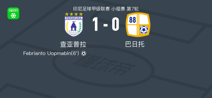 查亚普拉1-0巴日托,Febrianto Uopmabin制胜球战报bot @懂球帝2025-10-25 16:28北京时间10月25日印尼足球甲级联赛 小组赛 第7轮,查亚普拉主场对阵巴日托。查亚普拉Febrianto Uopmabin破门。最终比分查亚普拉 1-0 巴日托。点击查看本场比赛详细数据>>精彩瞬间第6分钟,查亚普拉球员斯罗耶尔助攻Febrianto Uopmabin打入一球。 球队阵容 技术统计 展开更多