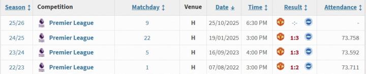 曼联与布莱顿此前在老特拉福德的17次交锋中,曼联12胜2平3负占据明显优势,但前三个赛季布莱顿在曼联主场都能取胜。