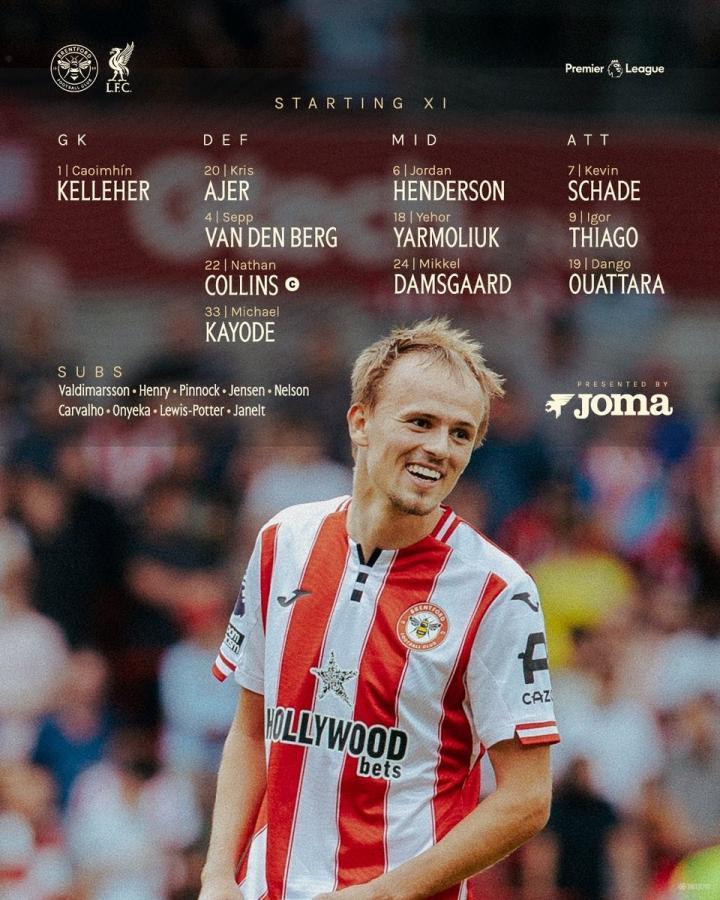 北京时间10月26日03:00,英超 第9轮,布伦特福德主场迎战利物浦,赛前双方球队首发名单公布如下: