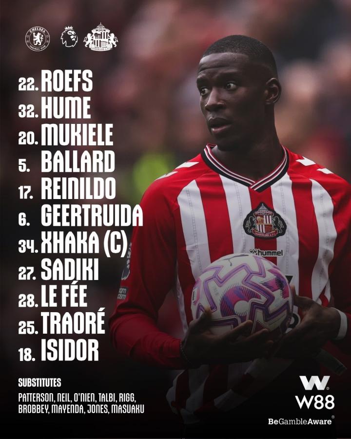 桑德兰首发:22-罗埃夫斯、32-休姆、20-穆杰莱、5-巴拉德、17-阿卜杜拉-巴、6-海特勒伊达、34-扎卡、27-萨迪基、28-勒费埃、25-伯特兰-特拉奥雷、18-伊西多尔