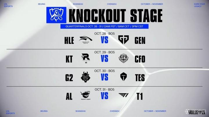 北京时间10月25日,S15世界赛结束瑞士轮全部比赛的争夺,八强抽签已经完成。官方随后公布了八强战的赛程安排,LCK内战HLE对Gen.G将会率先进行,AL和T1的遭遇战则安排在八强最后一天。
