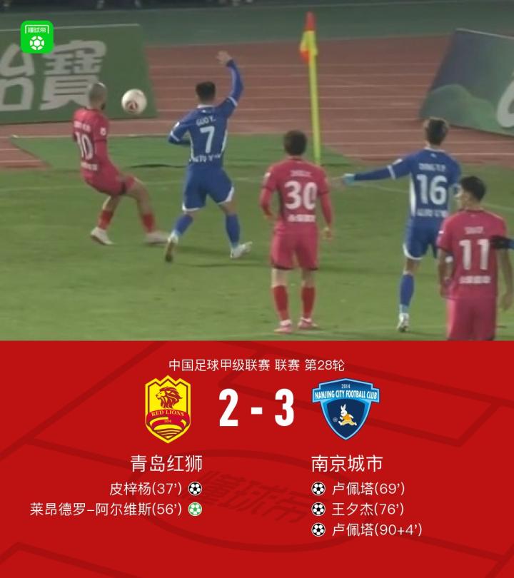 北京时间10月25日中国足球甲级联赛 联赛 第28轮,青岛红狮主场对阵南京城市。青岛红狮皮梓杨破门,莱昂德罗-阿尔维斯破门。南京城市卢佩塔梅开二度,王夕杰破门。最终比分青岛红狮 2-3 南京城市。