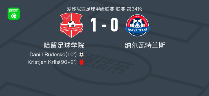 北京时间10月25日爱沙尼亚足球甲级联赛 联赛 第34轮,哈留足球学院主场对阵纳尔瓦特兰斯。哈留足球学院Daniil Rudenko破门。最终比分哈留足球学院 1-0 纳尔瓦特兰斯。