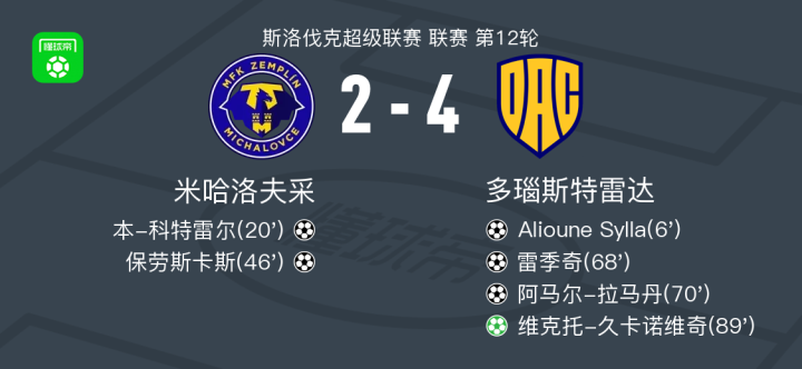 北京时间10月25日,斯洛伐克超级联赛第12轮,米哈洛夫采主场迎战多瑙斯特雷达。比赛开始后,多瑙斯特雷达率先打破僵局,格鲁比尔送出助攻,Alioune Sylla完成破门。随后米哈洛夫采迅速回应,萨穆埃尔-拉莫斯助攻本-科特雷尔将球送入对方网窝,扳平比分。易边再战,泰勒-哈特精准传球帮助保劳斯卡斯建功,主队一度取得领先。然而多瑙斯特雷达展现出强劲反击能力,加瓜助攻雷季奇破门,欧罗助攻阿马尔-拉马丹再下一城,将比分反超。临近终场,维克托-久卡诺维奇主罚点球命中,为客队锁定胜局。最终全场比赛结束,米哈洛夫采以2比4不敌多瑙斯特雷达。