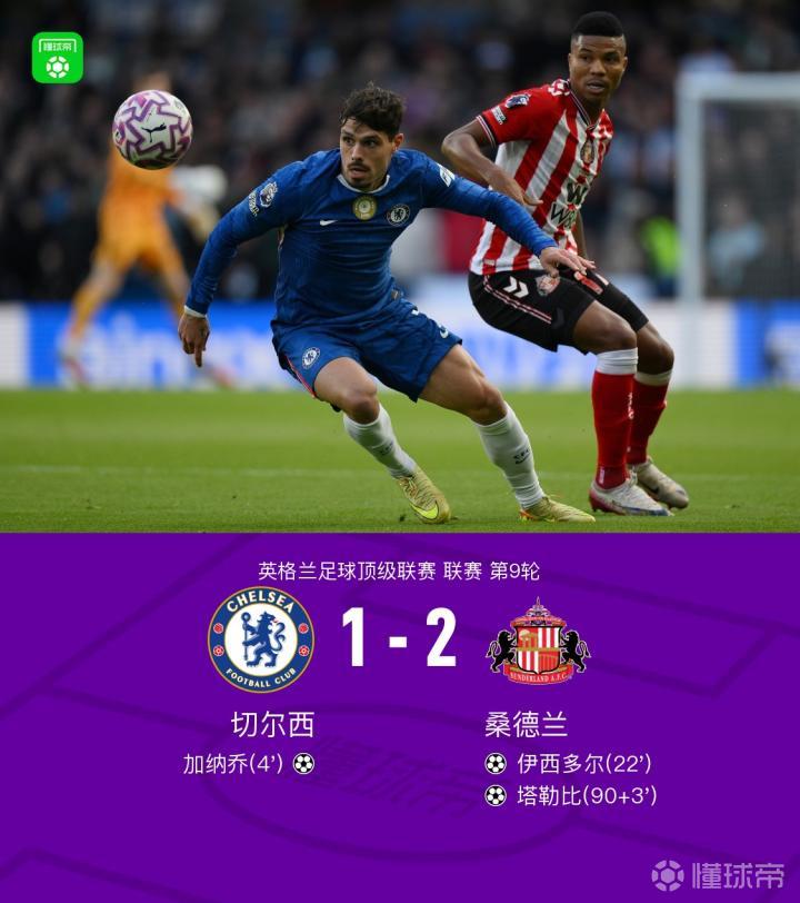 北京时间10月25日英格兰足球顶级联赛 联赛 第9轮,切尔西主场对阵桑德兰。上半场加纳乔斩获蓝军生涯首球,之后切尔西门前混乱,伊西多尔破门扳平。下半场补时阶段塔勒比推射绝杀。最终切尔西1-2不敌桑德兰。