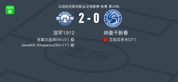 浩罕1912 2-0纳曼干新春,吉奥尔加泽建功,Javokhir Khusanov锁定胜局