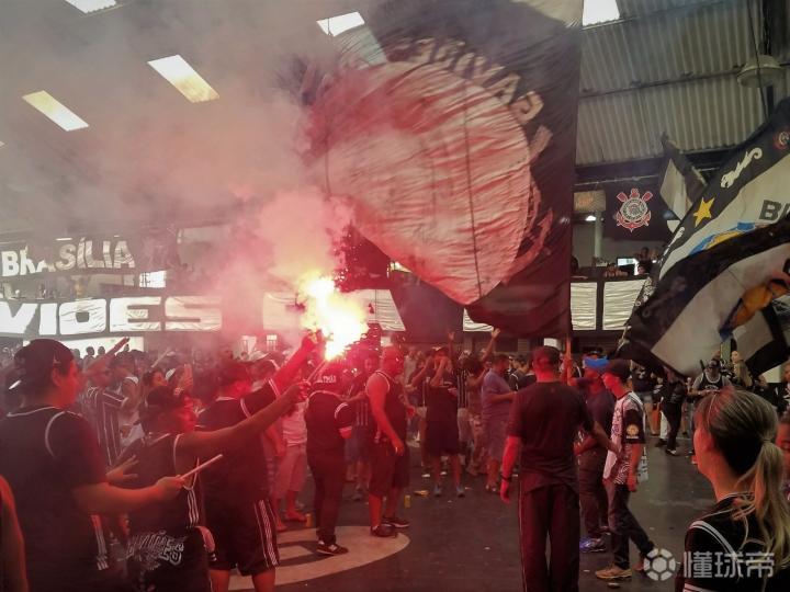 官方数字是32万,但这个很难确定。我们跟其他球迷一样,都是被挤着、推着涌进了体育场的看台区,说实话,这场面就像沙丁鱼被灌装进罐头一样,在拥有4.6万个座位的场地里,一切可以容纳人的角落都没有被放过。现场噪音震耳欲聋,球迷们通过各种各样的发声方式来营造主场令人生畏的强大助威气势。但鉴于以往的暴力冲突以及安全预警(2012年帕尔梅拉斯曾经发生过8名球迷遭枪杀的悲剧,再比如2014年帕尔梅拉斯球迷强拆科林蒂安主场近900个座位的事迹),因此所有写有攻击性言语旗帜、存在火灾隐患的信号弹、以及助威鼓、喇叭都被禁止携带。但这里也有一些例外,部分球迷组织是被允许在自己球队的主场“兴风作浪”的。