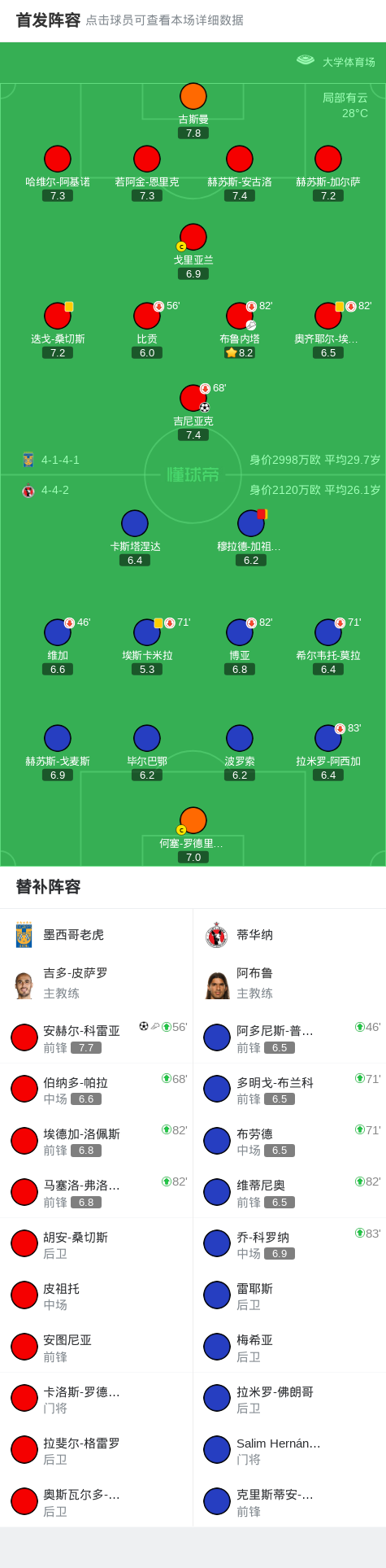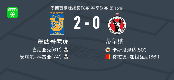墨西哥老虎2-0蒂华纳取墨超3连胜,吉尼亚克破门,安赫尔-科雷亚锦上添花
