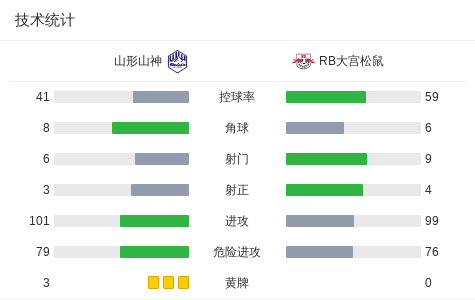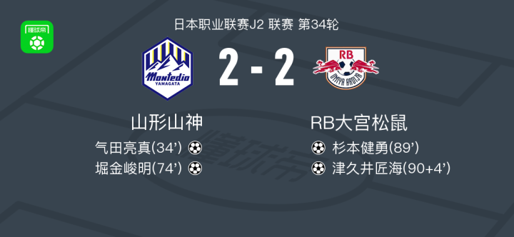 北京时间10月26日,日本职业足球乙级联赛第34轮,山形山神坐镇主场迎战RB大宫松鼠。比赛中,气田亮真率先为山形山神打破僵局,随后堀金峻明再下一城,帮助球队扩大领先优势。RB大宫松鼠并未放弃,杉本健勇在比赛末段破门扳回一球,紧接着津久井匠海在伤停补时阶段再度攻入一球,完成逆转绝平。最终双方以2比2握手言和。