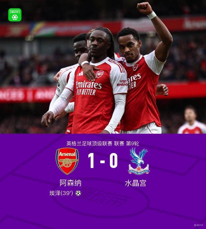 第39分钟,埃泽点球点处二踢脚凌空破旧主,阿森纳1-0领先水晶宫!