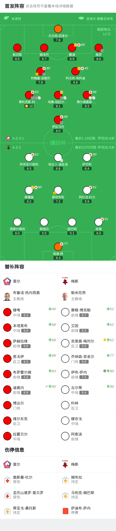 第24分钟,伊加马内低射破门,里尔1-0梅斯