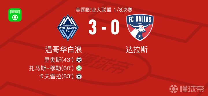 温哥华白浪3-0大胜达拉斯,托马斯-穆勒点射、卡夫雷拉破门