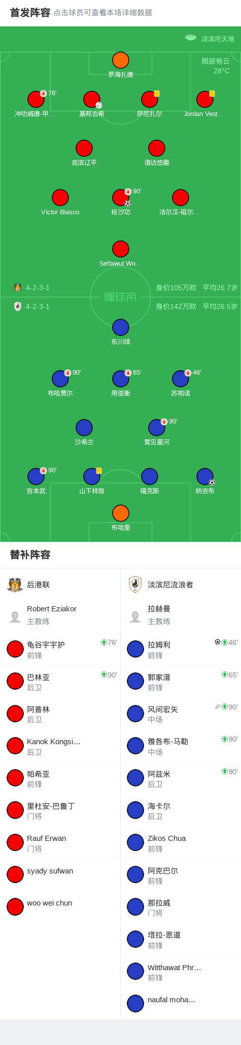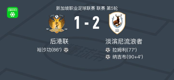 北京时间10月27日,新加坡职业足球联赛第5轮展开角逐,后港联坐镇主场迎战淡滨尼流浪者。比赛中,淡滨尼流浪者由拉姆利率先破门,取得领先。随后,后港联球员裕沙功接队友助攻扳平比分。下半场补时阶段,淡滨尼流浪者风间宏矢送出助攻,纳吉布攻入制胜球。最终,双方战成1-2,淡滨尼流浪者客场全取三分。