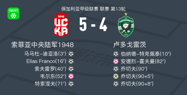北京时间10月27日保加利亚甲级联赛 联赛 第13轮,索菲亚中央陆军1948主场对阵卢多戈雷茨。索菲亚中央陆军1948马马杜-迪亚洛破门,Elias Franco破门,索夫雷罗破门,特索涅夫破门,安德烈-霍夫曼自摆乌龙。卢多戈雷茨伯纳德-特克佩泰破门,乔切夫梅开二度,韦尔东自摆乌龙。最终比分索菲亚中央陆军1948 5-4 卢多戈雷茨。