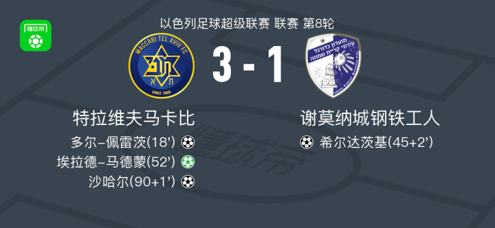 特拉维夫马卡比3-1谢莫纳城钢铁工人,埃拉德-马德蒙点射,沙哈尔建功