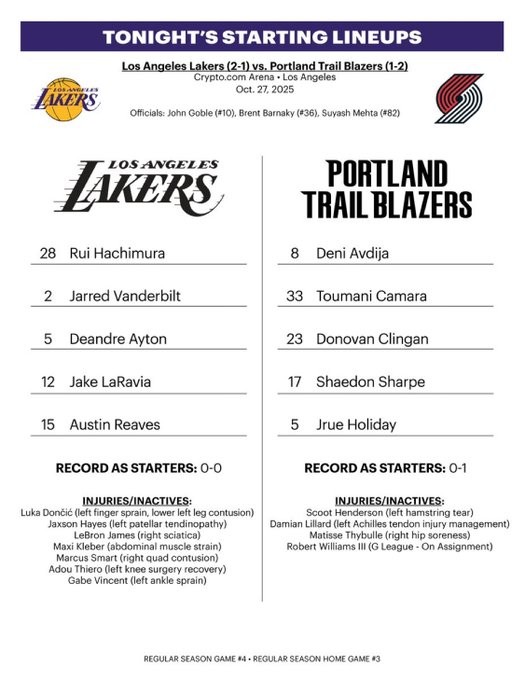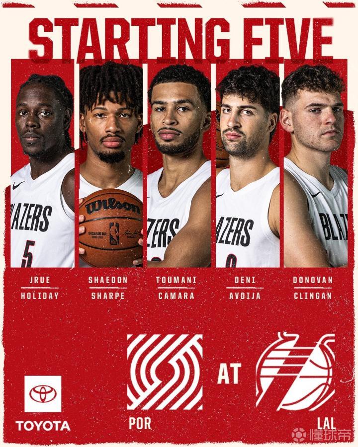 北京时间今日10:30,开拓者队将客场对阵背靠背第二场比赛的对手湖人队,赛前,开拓者队公布了本场比赛的首发名单。