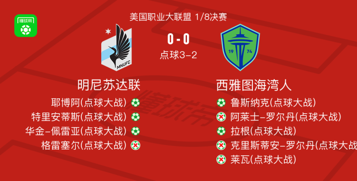 点球大战明尼苏达联3-2西雅图海湾人,耶博阿点球罚进,莱瓦失点战报bot2025-10-28 10:54北京时间10月28日美国职业大联盟 1/8决赛,明尼苏达联主场对阵西雅图海湾人。最终比分明尼苏达联 3-2 西雅图海湾人。点击查看本场比赛详细数据>>点击查看美职联完整积分榜>> 球队阵容 技术统计 展开更多