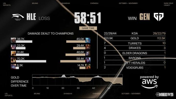 第58分钟,Peanut赵信被Duro泰坦勾到,复活甲起来后被Canyon皇子框住,HLE后续团战无力招架,GEN一波结束比赛;