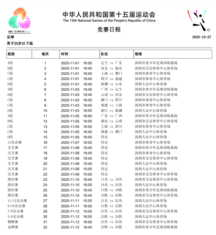 煎饼果子不要钱第十五届全国运动会男子足球U20组将于2025年11月1日16点在广东省深圳市打响,揭幕战由辽宁队对战东道主广东队,决赛将在2025年11月12日19:45进行。作为全运会足球最受关注的比赛,王钰栋领衔的浙江队是否卫冕成功,还是兵强马壮的山东队兵不血刃,让我们拭目以待。根据各队提交的预报名大名单,其中浙江队王钰栋以150万欧身价傲视群雄、大连队毛伟杰以37.5万欧位居第二、广东队张志雄以32.5万欧位居第三;备受瞩目的留洋球员中,马贝拉杜月徵在山东队册、邓伯什王博豪在云南队册、另还有辽宁队刘士铭(西班牙SC雷克纳)、湖北队于贵哲(塞尔维亚甲级泽蒙)、上海队刘锦程(葡甲波尔蒂芒人U23)、四川队郭晨希(奥地利地区格罗迪格B队)、山东队陈仕晗(比利时业余罗切弗托依斯联)以及山东队王皓文(上赛季效力西班牙U19荣誉联赛巴达洛纳)。