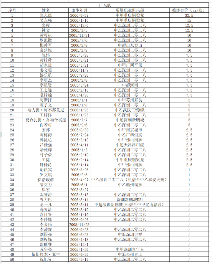 广东队整体以中乙深圳二零二八为班底,该队本赛季位列中乙冲冠组第三,距离晋级中甲仅一步之遥,原恒大足校青训现同效力重庆铜梁龙的张志雄和吴永强是本次广东队身价最高的球员。