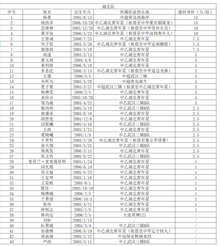 湖北队以中乙湖北青年星球员为主,外加部分武汉三镇B队球员组成的主力框架,本赛季中超表现出色的青岛西海岸杨希将代表湖北出战,同组云南与河北整体实力一般,湖北队小组出线难度不高。