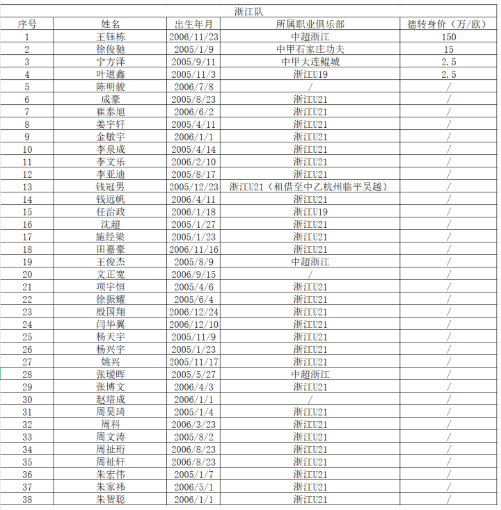 全运会U20大名单,王钰栋身价领衔,毛伟杰张志雄分列二三