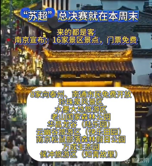 南京文旅:16家景区对“苏超”球迷免票,部分网红景点半价我是开封菜2025-10-28 22:09北京时间10月28日,南京文旅消息,南京16家景区对“苏超”决赛观赛球迷免票,部分网红景点半价。本周六“苏超”决赛将在南京奥体中心热血开踢。南京文旅早已备好诚意满满的专属福利,这个周末等你来嗨!16家景区景点免费,网红景点红山森林动物园、牛首山对观赛球迷半价。同时,南京文旅还宣布,将有8家景区对泰州球迷与南通球迷开放。展开更多