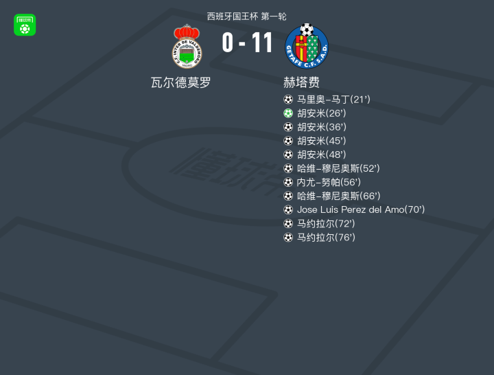 赫塔费11-0横扫瓦尔德莫罗,胡安米大四喜,马约拉尔梅开二度