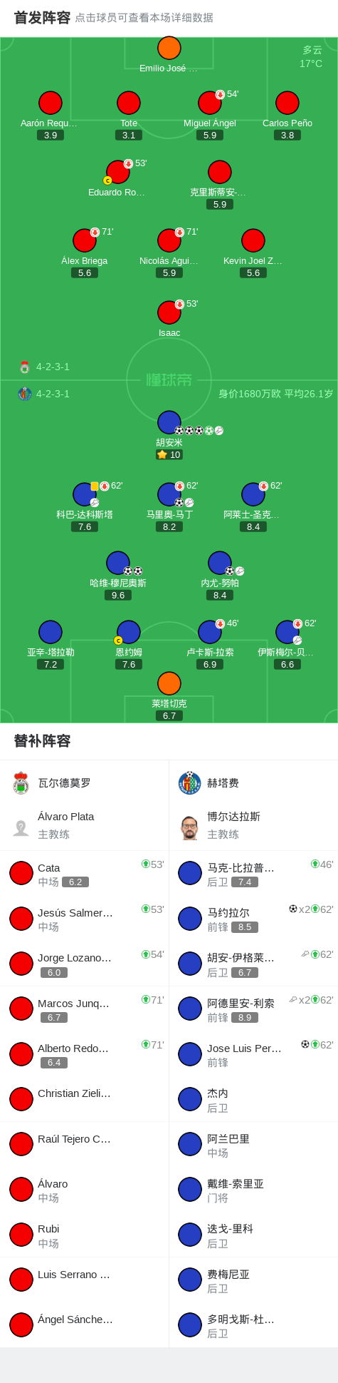 第70分钟,赫塔费球员阿德里安-利索助攻Jose Luis Perez del Amo打入一球。