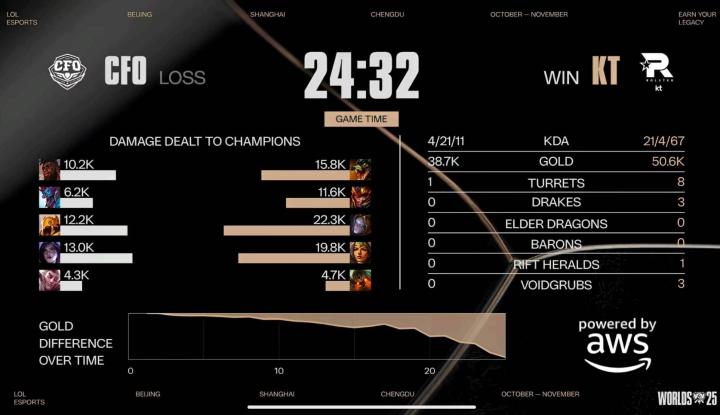 第23分钟,面对小龙魂的压力,CFO被迫出来应战,但经济差过大,KT团灭CFO不到25分钟结束比赛;