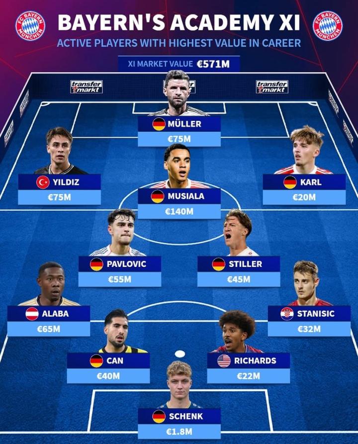 北京时间10月29日,德转列出了拜仁慕尼黑青训现役历史身价最高的11人阵容,穆西亚拉1.4亿欧元最高,托马斯-穆勒和凯南-伊尔迪兹7500万欧元并列第二。