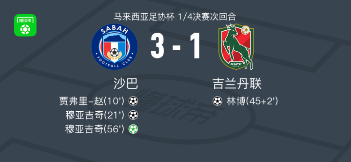 北京时间10月29日,马来西亚足协杯1/4决赛次回合展开较量,沙巴与吉兰丹联展开对决。比赛伊始,贾弗里-赵为沙巴率先破门,帮助球队取得领先。随后穆亚吉奇再入一球,进一步扩大优势。上半场补时阶段,林博为吉兰丹联扳回一城。易边再战,穆亚吉奇主罚点球命中,完成个人第二粒进球。最终全场比赛结束,沙巴以3比1战胜吉兰丹联。两回合总比分沙巴5比2晋级下一轮。