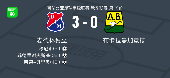 麦德林独立3-0大胜布卡拉曼加竞技,莱德-贝里奥1传1射,菲德里谢夫斯基建功