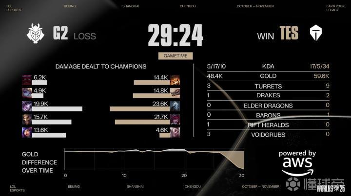 第28分钟,TES大龙推进打成0换4又一次团灭G2后完成一波,比赛结束,TES晋级!