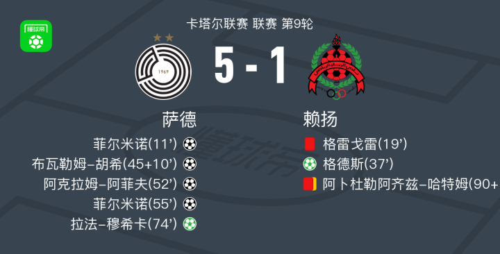 北京时间10月31日卡塔尔联赛 联赛 第9轮,萨德主场对阵赖扬。萨德菲尔米诺梅开二度,布瓦勒姆-胡希破门,阿克拉姆-阿菲夫破门,拉法-穆希卡破门。赖扬格德斯破门。最终比分萨德 5-1 赖扬。