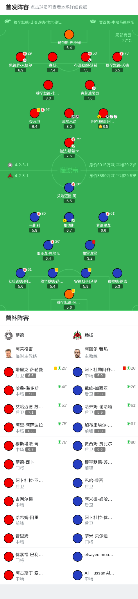 上半场补时第10分钟,萨德球员阿克拉姆-阿菲夫助攻布瓦勒姆-胡希打入一球。