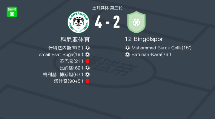 北京时间10月31日土耳其杯 第三轮,科尼亚体育对阵12 Bingölspor。科尼亚体育什特法内斯库破门,İsmail Esat Buğa破门,比约洛破门,梅利赫-博斯坦破门。12 BingölsporMuhammed Burak Çelik破门,Batuhan·Kara破门。最终比分科尼亚体育 4-2 12 Bingölspor。