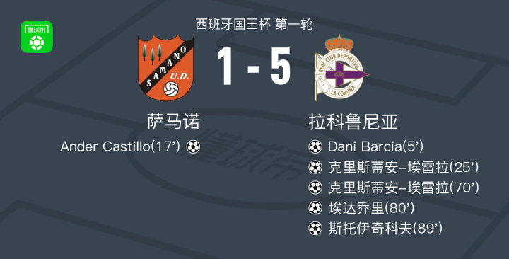 北京时间10月31日西班牙国王杯 第一轮,萨马诺对阵拉科鲁尼亚。萨马诺Ander Castillo破门。拉科鲁尼亚Dani Barcia破门,克里斯蒂安-埃雷拉梅开二度,埃达乔里破门,斯托伊奇科夫破门。最终比分萨马诺 1-5 拉科鲁尼亚。