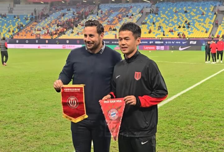 拜仁名宿皮萨罗到访成都蓉城主场,与甘锐互换队旗