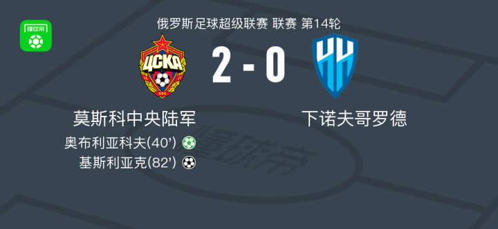 莫斯科中央陆军2-0下诺夫哥罗德,奥布利亚科夫建功,基斯利亚克锁定胜局