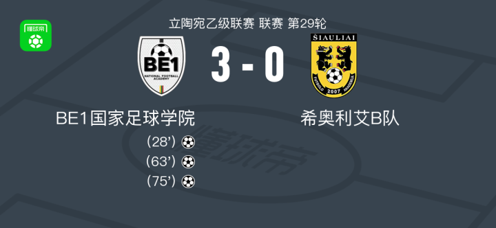 BE1国家足球学院3-0大胜希奥利艾B队战报bot @懂球帝2025-11-01 01:59北京时间11月1日立陶宛乙级联赛 联赛 第29轮,BE1国家足球学院主场对阵希奥利艾B队。最终比分BE1国家足球学院 3-0 希奥利艾B队。点击查看本场比赛详细数据>>精彩瞬间第28分钟,BE1国家足球学院球员打入一球。第63分钟,BE1国家足球学院球员打入一球。第75分钟,BE1国家足球学院球员打入一球。 球队阵容 技术统计 展开更多