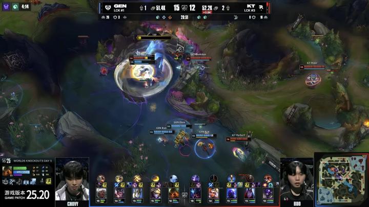 第11分钟,KT中路三人对Chovy施压,被丝血极限逃跑,GEN顺势收下己方第二条小龙;