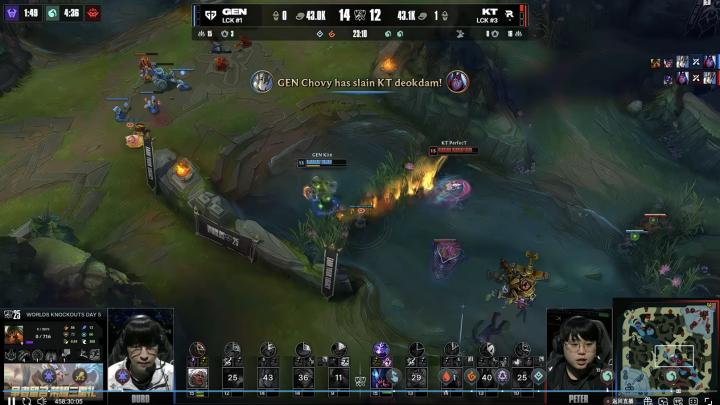 第28分钟,又是Peter被Ruler找到机会先被击杀掉,GEN收下听牌水龙+中一塔后直接逼大龙,Canyon拼惩成功,随后KT上辅也被击杀;