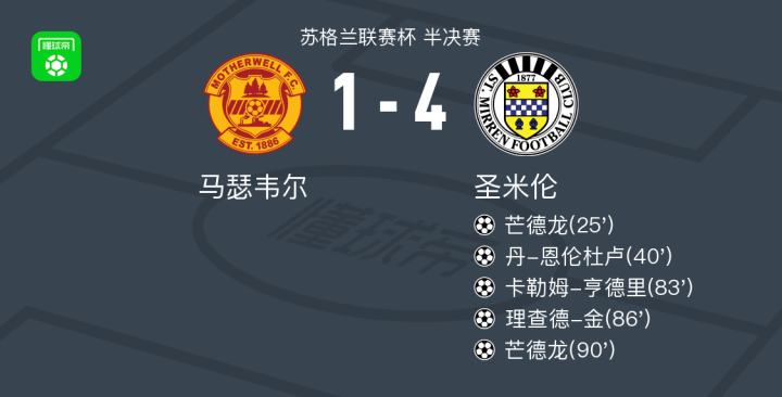 北京时间11月2日苏格兰联赛杯 半决赛,马瑟韦尔对阵圣米伦。最终比分马瑟韦尔 1-4 圣米伦。