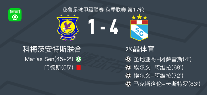 北京时间11月2日,秘鲁足球甲级联赛秋季联赛第17轮,科梅茨安特斯联合主场迎战水晶体育。比赛伊始,水晶体育的圣地亚哥-冈萨雷斯率先破门,为球队取得领先。上半场补时阶段,科梅茨安特斯联合获得点球机会,Matías Sen主罚命中,将比分扳平。易边再战,科梅茨安特斯联合遭遇减员,门德斯被红牌罚下。随后水晶体育抓住人数优势扩大比分,埃尔文-阿维拉接普雷特利助攻再下一城。不久后,圣地亚哥-冈萨雷斯送出助攻,埃尔文-阿维拉完成梅开二度。比赛尾声阶段,莱安德罗-索萨助攻马克斯洛伦-卡斯特罗破门,锁定胜局。最终全场比分定格为科梅茨安特斯联合 1-4 水晶体育。