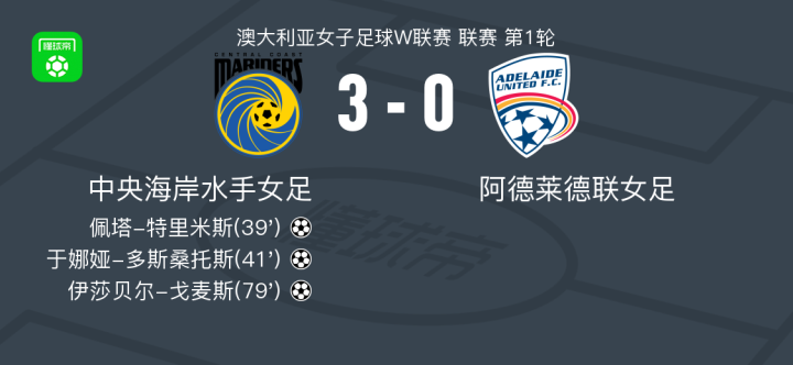 北京时间11月2日,澳大利亚女子足球A联赛 第1轮,中央海岸水手女足坐镇主场迎战阿德莱德联女足。比赛中,佩塔-特里米斯接I. Di Sipio的精准传递后破门得分,为球队先拔头筹。随后不久,佩塔-特里米斯送出助攻,帮助于娜娅-多斯桑托斯再下一城,进一步扩大领先优势。下半场,伊莎贝尔-戈麦斯凭借个人能力攻入一球,将比分锁定为3-0。最终,中央海岸水手女足以三球完胜对手,取得赛季开门红。