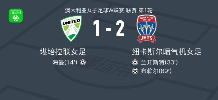 北京时间11月2日澳大利亚女子足球W联赛 联赛 第1轮,堪培拉联女足主场对阵纽卡斯尔喷气机女足。堪培拉联女足海曼破门。纽卡斯尔喷气机女足兰开斯特破门,布赖尔破门。最终比分堪培拉联女足 1-2 纽卡斯尔喷气机女足。